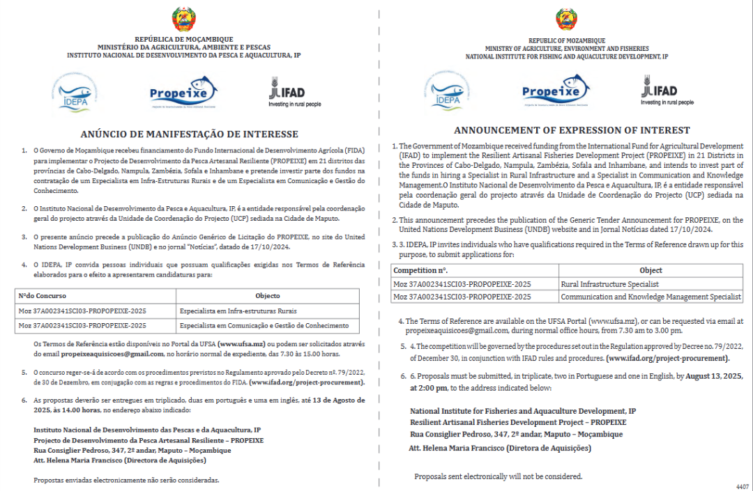 O Governo de Moçambique reforça a implementação do Projeto de Desenvolvimento da Pesca Artesanal Resiliente (PROPEIXE), financiado pelo Fundo Internacional...