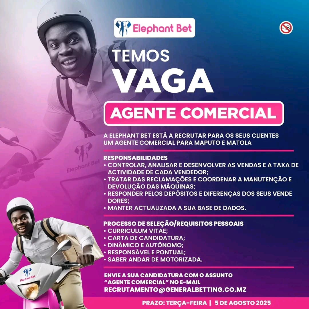 Vaga para Agente Comercial em Maputo e Matola A Elephant Bet está a recrutar, para os seus clientes, um Agente...