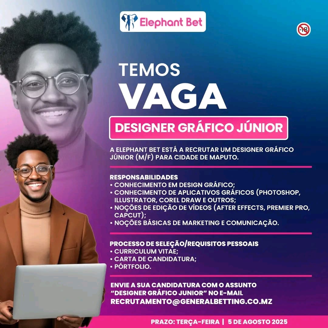 Elephant Bet abre vaga para Designer Gráfico Júnior em Maputo A empresa Elephant Bet anunciou a abertura de uma vaga...