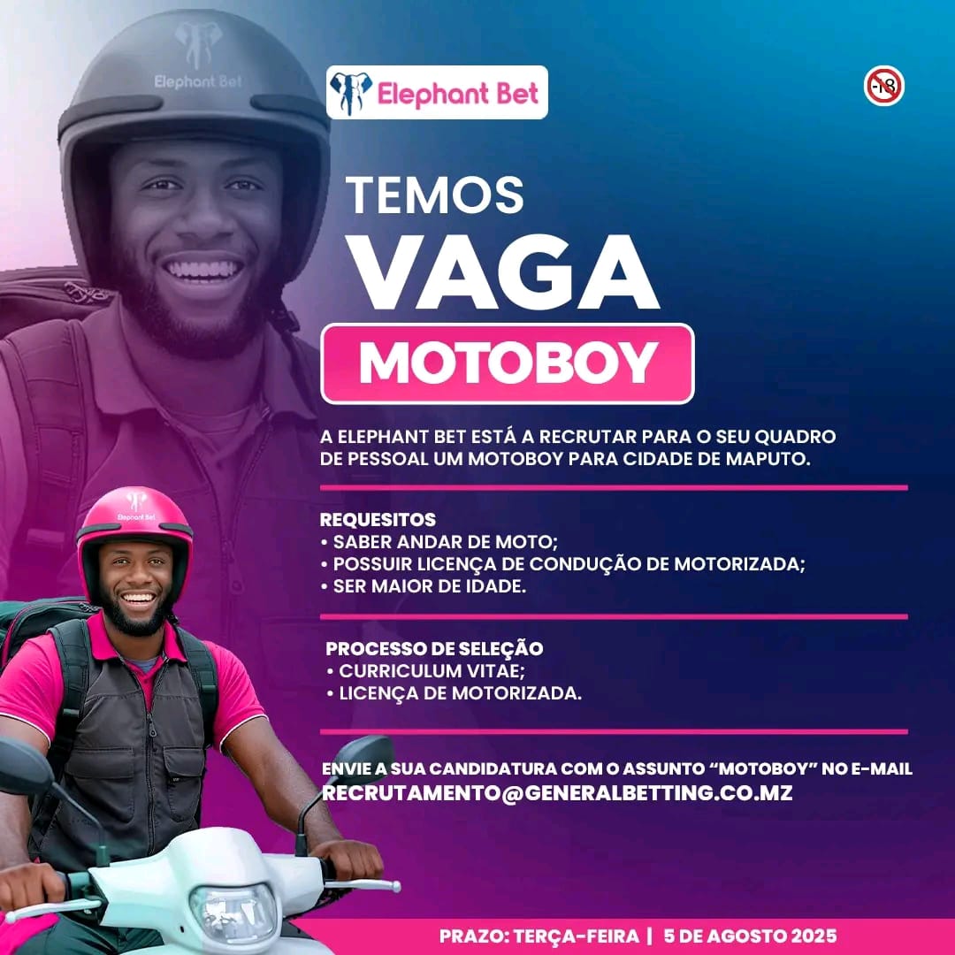 Elephant Bet recruta motoboy para Maputo A Elephant Bet anunciou a abertura de uma vaga para motoboy na cidade de...