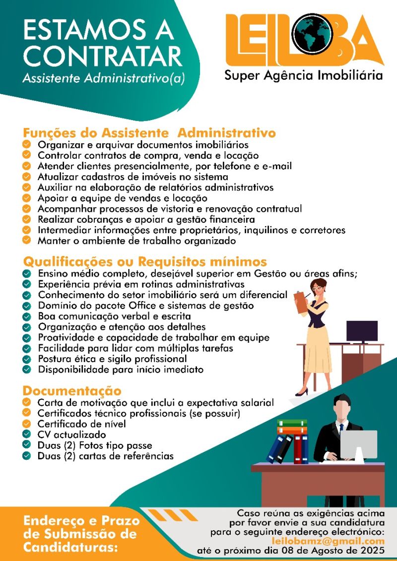Super Agência Imobiliária recruta Assistente Administrativo(a) A Super Agência Imobiliária está a contratar um(a) Assistente Administrativo(a) para reforçar a sua...