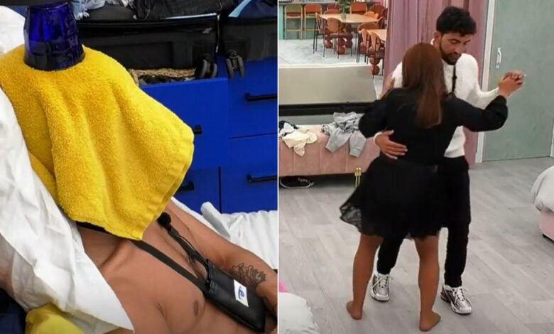 No outro quarto, segundo as imagens divulgadas pela TVI, surge Diogo, sentado na cama com uma toalha amarela e um copo azul na cabeça.
